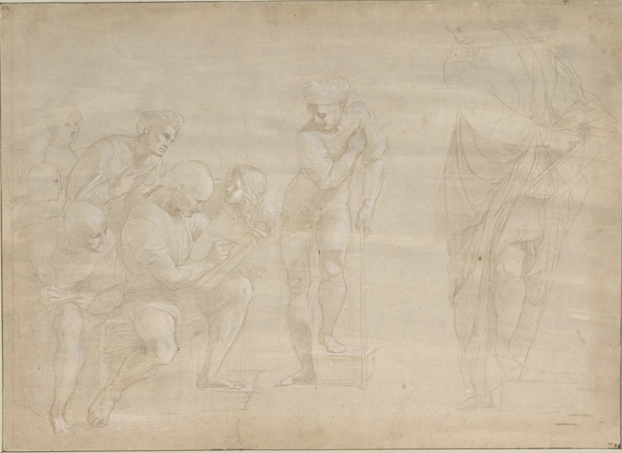 Il viaggio prosegue a Roma, dove Raffaello diventa l’artista di corte dei Papi Giulio II e Leone X, realizzando affreschi che avrebbero definito il Rinascimento romano. Nella Stanza della Segnatura, studi preparatori per opere come La scuola di Atene e La Disputa dimostrano la sua padronanza della prospettiva, della composizione e del dinamismo delle figure. In questi studi emerge anche l’interesse di Raffaello per l’architettura classica e la capacità di organizzare lo spazio come se fosse una vera e propria scultura dipinta. I disegni mostrano come la pratica quotidiana e la riflessione su forme e proporzioni guidassero ogni scelta, rendendo il suo processo creativo quasi scientifico.